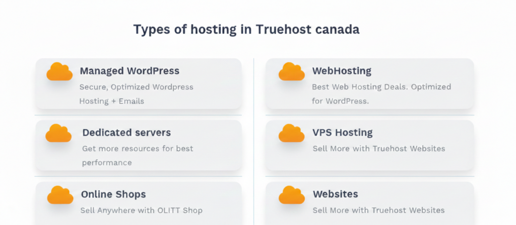 Hosting types available on Truehost.ca include: Website builders for ai websites, managed WordPress hosting, Dedicated server hosting for enterprise projects, online stores for ecommerce stores and E-commerce shops, VPS hosting for applications and Email hosting. Reseller hosting is the White-labelled hosting offered to entrepreneurs to grow their digital agencies.Web-hosting can be CPanel linux hosting or some prefer Plesk windows hosting.